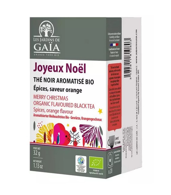 Thé noir Joyeux Noël bio & équitable de la marque Jardins de Gaïa Thé de lumière pour réchauffer les c?urs? Son doux parfum d?épices, son infusion dorée et son goût moelleux vous transportent dans la magie de Noël. A partager ! Poids net et contenance : 32 g, 20 infusettes