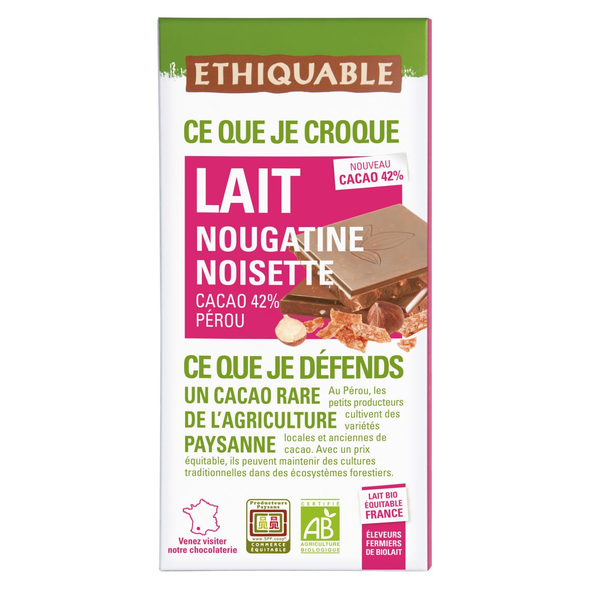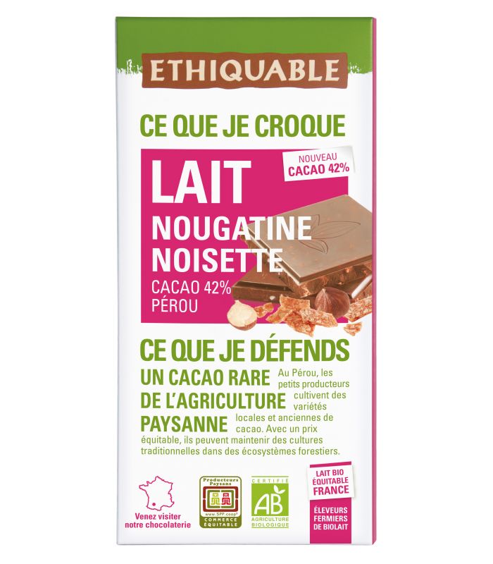 Chocolat Lait Nougatine et Noisettes bio & équitable de la marque ETHIQUABLE. La coopérative CONACADO s'est créée pour améliorer les conditions de vie de petits cultivateurs qui produisaient un cacao standar mal rémunéré par les acteurs de la filière. Le changement majeur impulsé par la coopérative est la fermentation du cacao après récolte. Cette étape essentielle dans la formation des arômes du futur chocolat permet aujourd'hui aux producteurs de tirer un meilleur profit de leurs récoltes. Poids net : 100 g.
