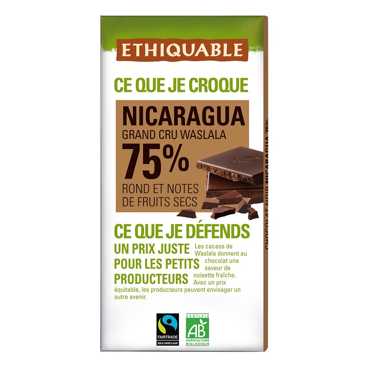 Chocolat Noir Grand Cru 75% bio & équitable de la marque Ethiquable
