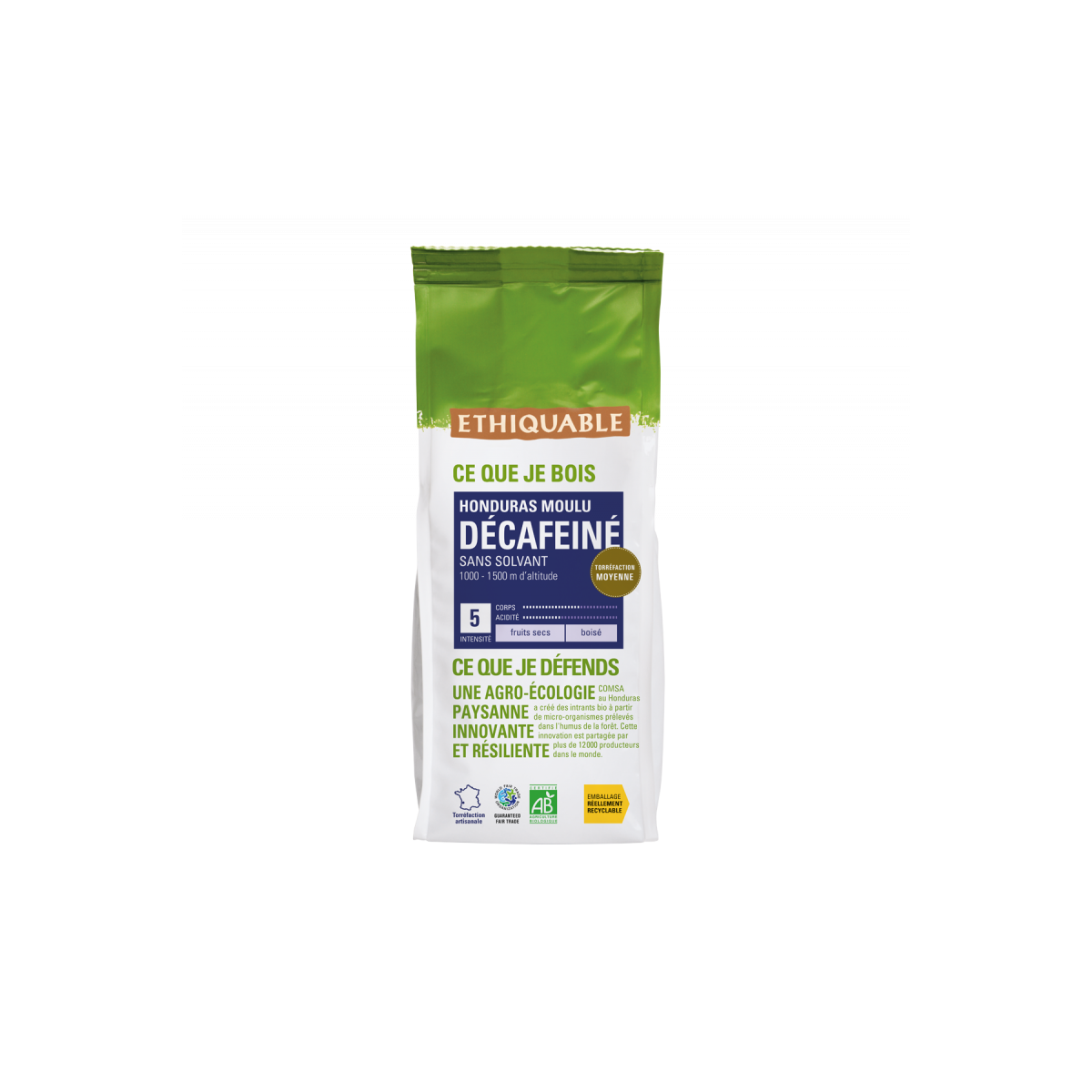 Café décafeiné d'Ethiopie bio & équitable de la marque ETHIQUABLE. ""Comme les vins, les cafés ont leurs terroirs. Le caractère d'un arabica est lié à la terre, au climat, et surtout à l'altitude. Les grains de café y mûrissent plus lentement, révélant la complexité des arômes et une fine acidité. Ce Moka d'Ethiopie est cultivé en haute altitude (de 1500 à 2200m). Il présente une note unique de fleurs blanches, évoquant le jasmin et la fleur d'oranger. Corps : 2/5 Arôme : 3/5 Fruité : 3/5 Poids net : 250 g