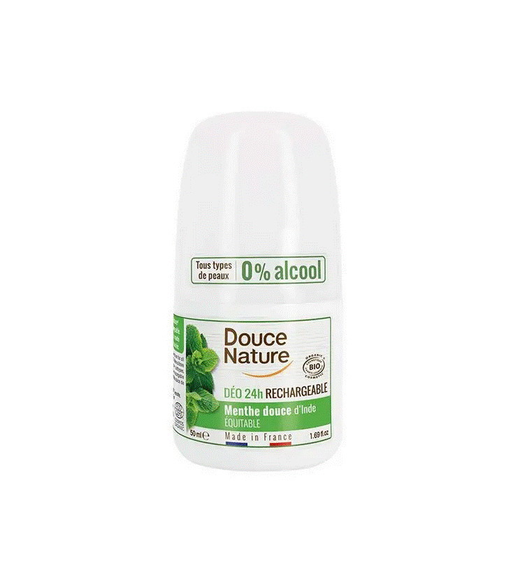 Déodorant à bille bio de la marque Douce Nature. - A la poudre de bambou, parfum floral à la menthe poivrée (rafraîchit, purifie). - Actifs déodorants d'origine végétale. - Ne bloque pas le processus naturel de transpiration - Ne tache pas les vêtements. Poids net : 50 ml