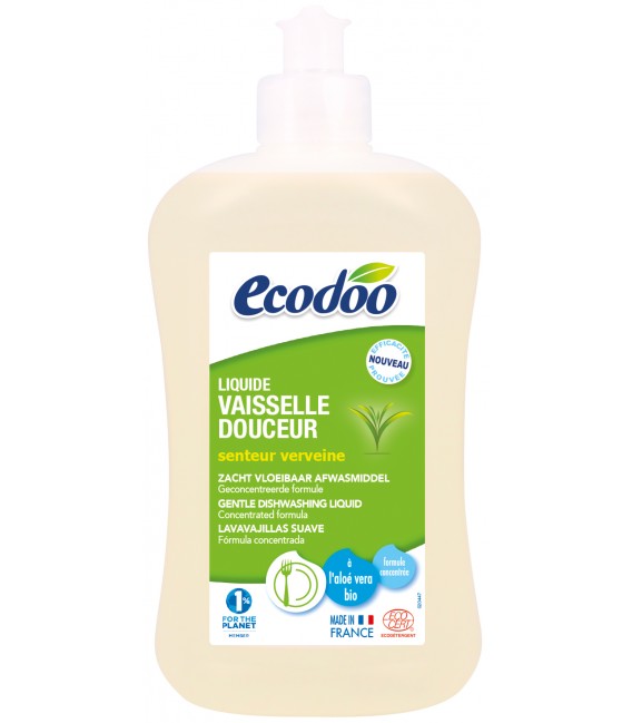 Liquide vaisselle douceur écologique à l'aloe vera de la marque Ecodoo Nettoie, dégraisse et fait briller la vaisselle Senteur verveine Formule sans colorant ni parfum de synthèse, c'est un produit non testé sur les animaux ! Contenance : 500 ml Ecodoo reverse 1% de son chiffre d'affaires à la protection de la planète