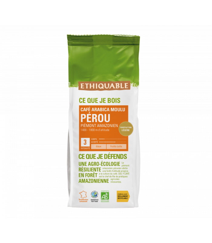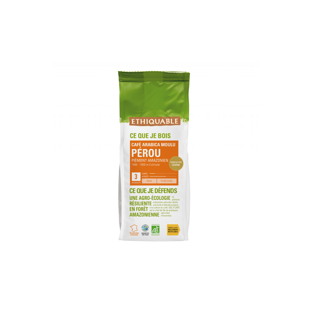 Café moulu du Pérou bio & équitable de la marque ETHIQUABLE. ""Comme les vins, les cafés ont leurs terroirs. Le caractère d'un arabica est lié à la terre, au climat et surtout à l'altitude. Les graines de café y mûrissent plus lentement, révélant la complexité des arômes et une fine acidité. Ce café du Pérou est cultivé en haute altitude (de 1000 à 1800m). Il offre un bon équilibre entre une fine acidité, un corps modéré et une belle note de fruits rouges."" corps : 1/5 arôme : 3/5 fruité : 4/5 Poids net : 250 g