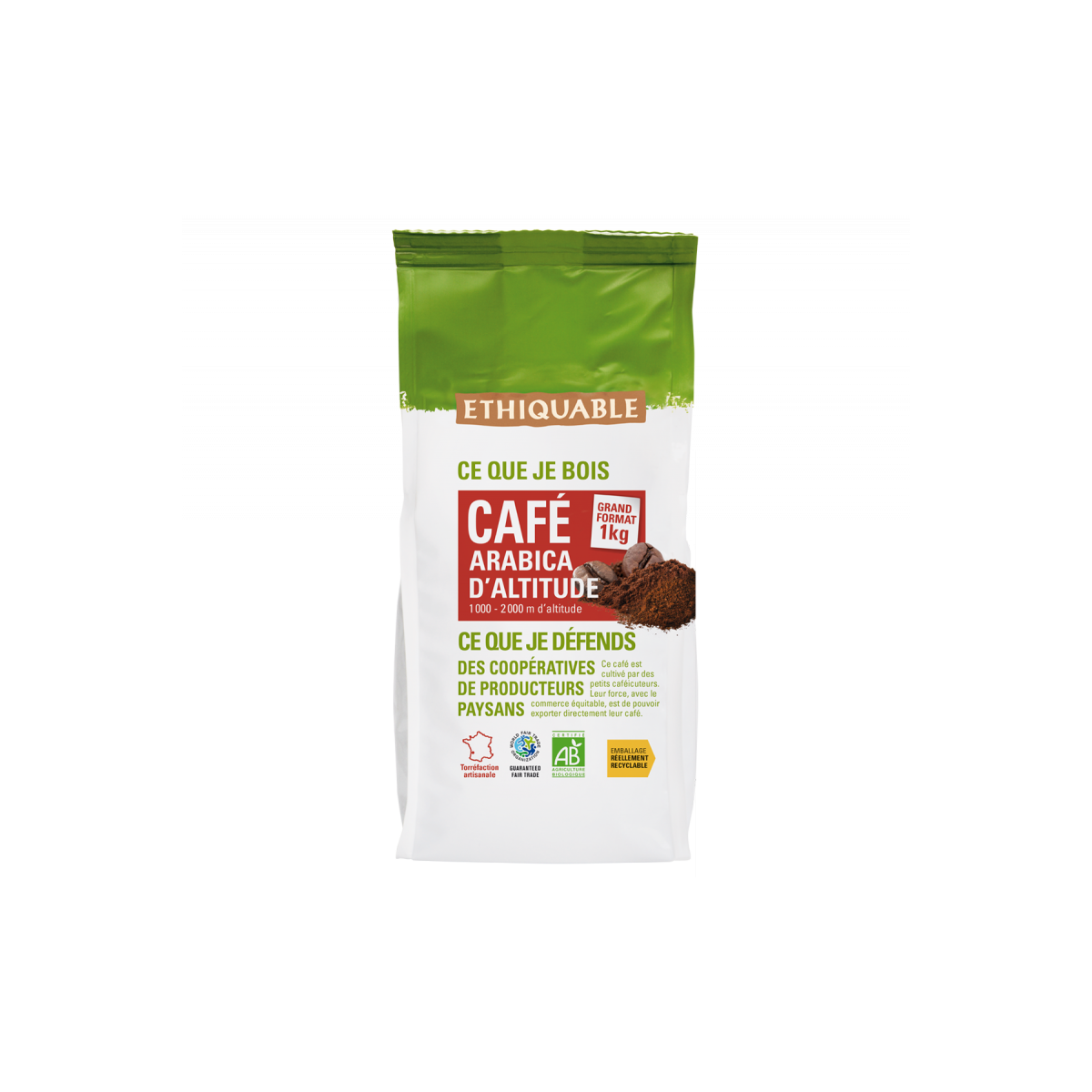 Café moulu du Pérou bio & équitable de la marque ETHIQUABLE. ""Comme les vins, les cafés ont leurs terroirs. Le caractère d'un arabica est lié à la terre, au climat et surtout à l'altitude. Les graines de café y mûrissent plus lentement, révélant la complexité des arômes et une fine acidité."" Ce café associe à la fois celui de l'Equateur et du Honduras : Le café de l'Equateur est cultivé en altitude (de 900 à 1500m). Il propose une belle harmonie entre acidité et force aromatique, avec une bonne persistance en bouche. corps : 2/5 arôme : 4/5 fruité : 4/5 Le café du Honduras est cultivé en altitude (de 800 à 1300m). Il révèle un corps bien présent animé par une subtile amertume et une pointe d'agrumes. corps : 4/5 arôme : 3/5 fruité : 3/5 Poids net : 1 kg