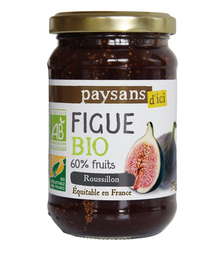 Confiture Extra Figue bio & équitable de la marque Paysans d'Ici. Avec ce produit, vous soutenez SiBio qui se mobilise pour une autre agriculture. Celle qui respecte l'homme et la terre. Dans le Roussillon, la vallée verdoyante de la Têt accueille une agriculture irriguée depuis 2000 ans. C'est un terroir privilégié entre mer et montagne, ensoleillé 300 jours par an, particulièrement adapté à la production de fruits et légumes bio. Les producteurs de SiBio cultivent des variétés régionales. Ils se sont associés pour transformer artisanalement leurs fruits en confiture. Poids net : 375 g Origine : Roussillon - France
