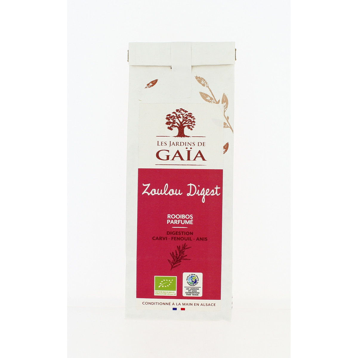 Rooibos Parfumé aux épices digestives ""Zoulou Digest"" de la marque JARDINS DE GAÏA. Voyage au coeur des peuples et traditions d'Afrique du Sud, ce merveilleux breuvage est né du mariage du rooibos et d’'épices digestives à la saveur anisée.