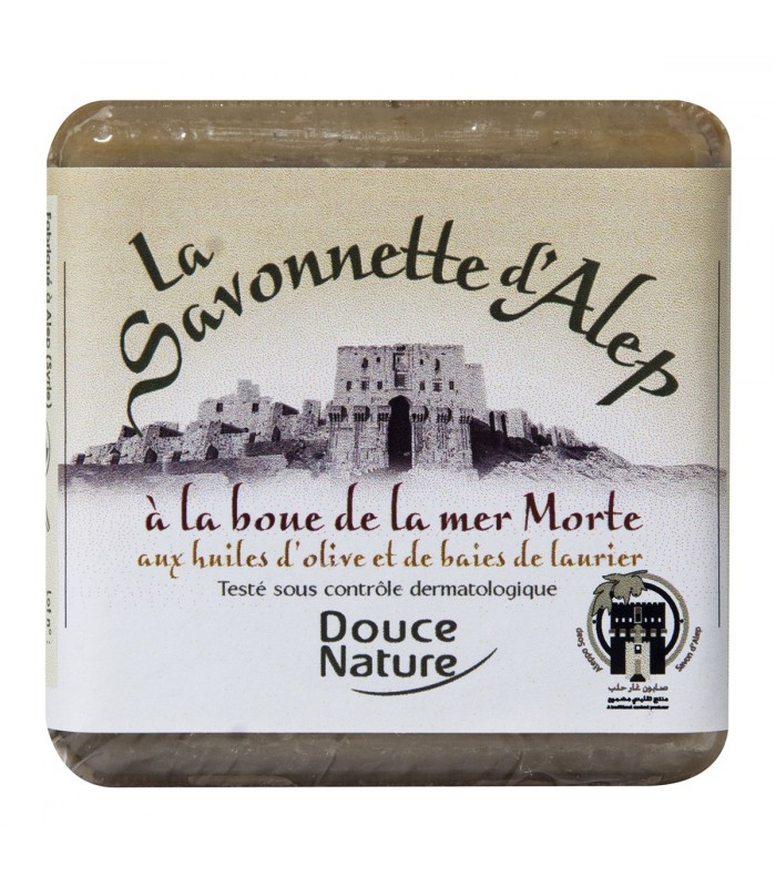 Savonnette d'Alep à la boue de la mer Morte bio de la marque Douce Nature. - à la boue de la mer Morte (à effet exfoliant) - huile d?olive 1ère pression à froid (origine Syrie) - huile de baies de laurier (origine Syrie) - 100% sur base végétale - testé sous contrôle dermatologique - garanti sans huile de palme, sans EDTA - s?utilise aussi bien pour le corps que pour le visage - savon conforme au cahier des charges ""Appélation d'origine protégée"" délivré par le Ministère de l'Agriculture Syrien Poids net : 100 g (+/- 10 g)
