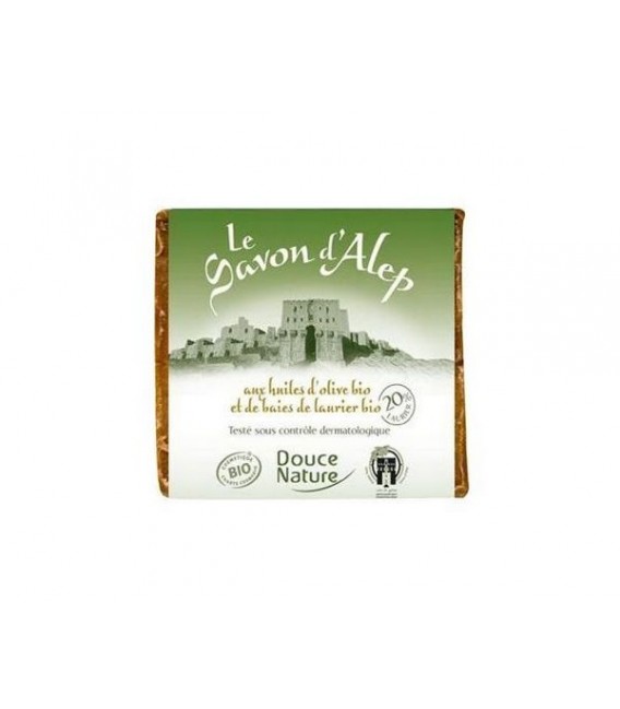Savon d'Alep en bloc 20% bio de la marque Douce Nature. - ingrédients de haute qualité garantis cueillis et transformés en Syrie - 80% huile d?olive 1ère pression à froid - 20% huile de baies de laurier sur le total des huiles - 100% sur base végétale - testé sous contrôle dermatologique - garanti sans huile de palme, sans EDTA - cuisson douce à la vapeur au chaudron - très doux, convient pour tous types de peaux pour un usage quotidien - s?utilise aussi bien pour le corps que pour le visage - découpé à la main d?où sa forme irrégulière - savon conforme au cahier des charges ""Appélation d'origine protégée"" délivré par le Ministère de l'Agriculture Syrien Poids net : 200 g (+/- 10 g)