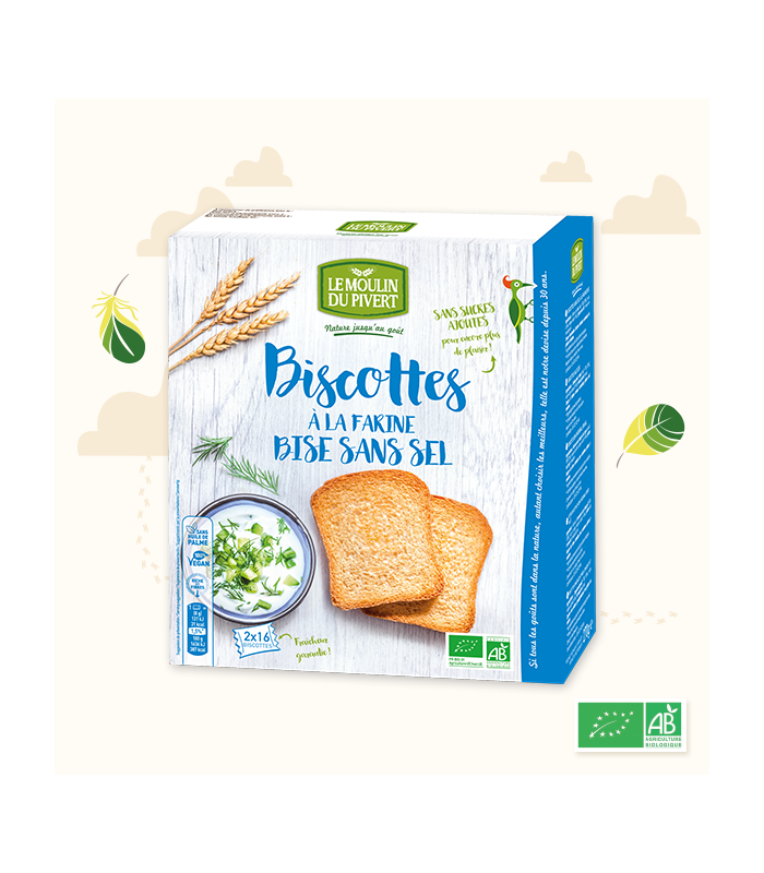 Ces biscottes sont fabriquées à partir de blés issus de l'Agriculture biologique, cultivés sans engrais chimiques ou insecticides de synthèse et fertilisés uniquement à l'aide d'engrais organiques. Sans sucres ajoutés, pour une meilleure hygiène alimentaire, ces biscottes développent grâce à une recette exclusive, toutes les qualités gustatives associées à l'utilisation d'une farine de qualité au goût traditionnel.