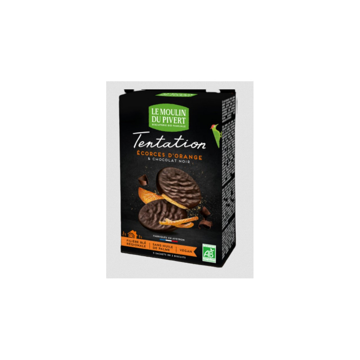 Biscuits Tentation enrobés de chocolat noir et aux écorces d'orange vegan et bio de la marque Le Moulin du Pivert