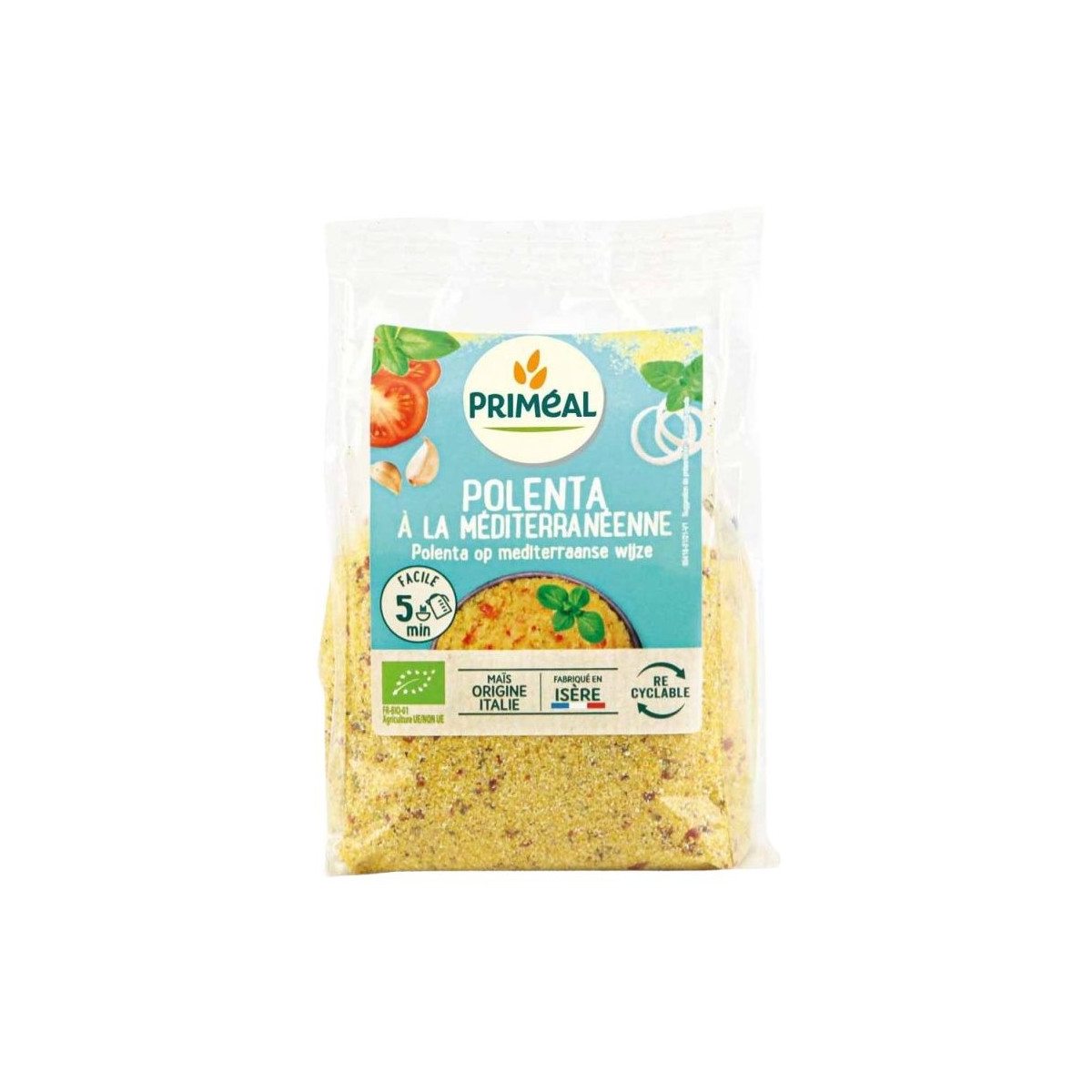 Semoule de maïs précuite*, mélange méditerranéen (tomate*, oignon*, ail*, origan*, huile d'olive*, basilic*, arôme naturel de basilic*), sel marin