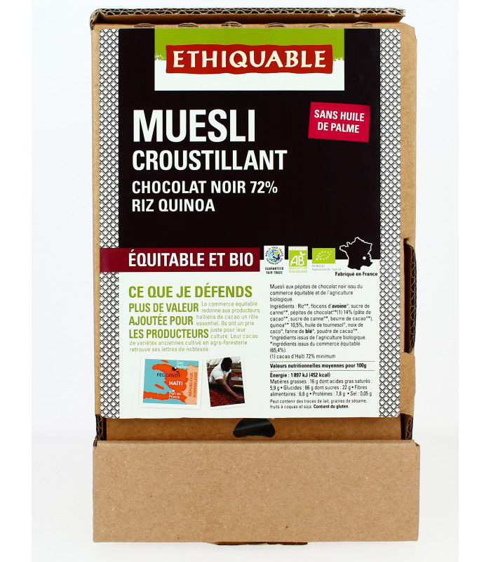 Muesli aux pépites de chocolat noir issu du commerce équitable et de l'agriculture biologique.