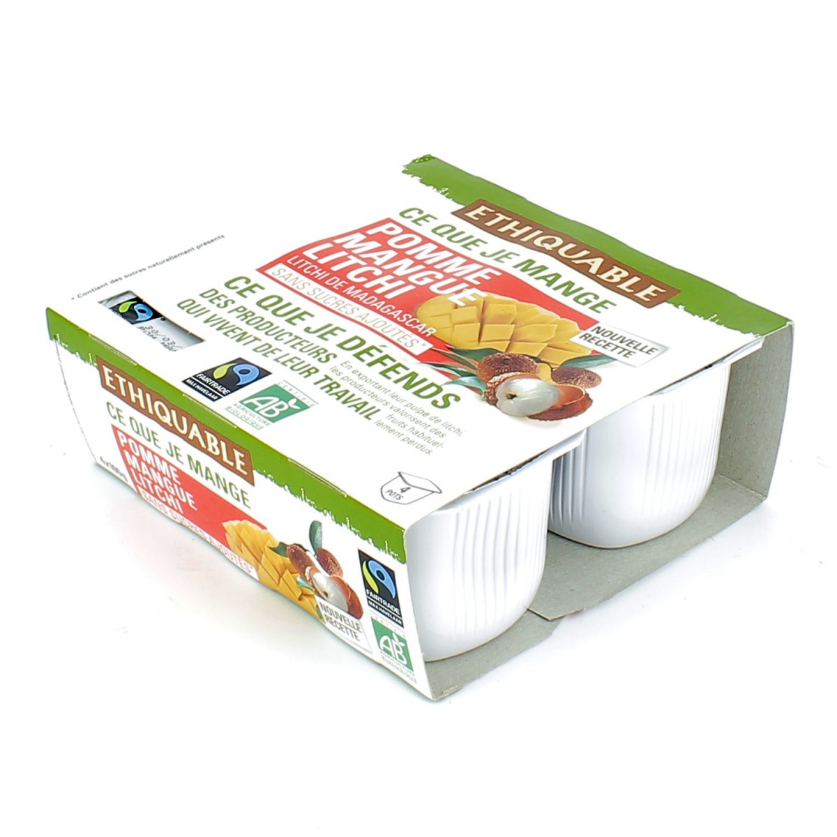 Compote de pomme mangue litchi de la marque Ethiquable Des producteurs qui vivent de leur travail : La coopérative Fanohana réunit 230 petits producteurs de litchi au nord-est de Madagascar. Par manque de débouchés, une grande partie de leur récolte est perdue. Avec l'appui sur le terrain d'Ethiquable, ils fabriquent aujourd'hui de la pulpe de litchi et l'exportent eux-mêmes. Une avancée décisive dans une région marquée par une grande pauvreté. Poids net : 400 g (4 x 100 g)