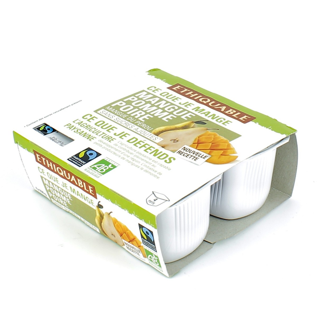 Compote de mangue, pomme & poire de la marque Ethiquable Face à une puissante agro-industrie, des petits producteurs de mangue du Pérou décident de s'unir en 1996 et créent la coopérative Apromalpi. Leur défi : s'affranchir des prix bas du marché local. Le prix équitable leur assure un revenu stable et leur niveau de vie a ainsi augmenté de 15 à 30%. Poids net : 400 g (4 x 100 g)