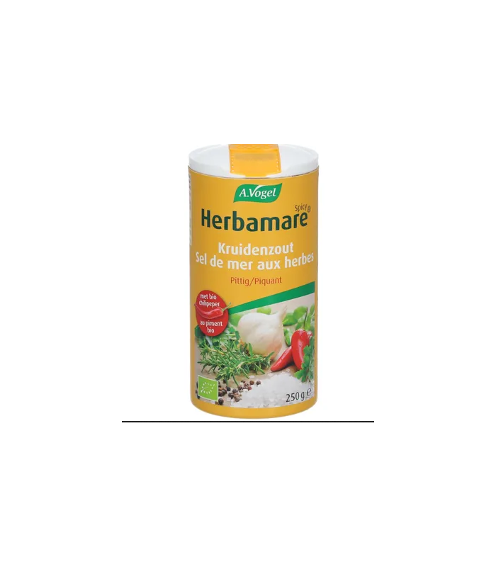 Herbamare® Spicy de A.Vogel est un mélange de sel de mer naturel, légumes et herbes aromatiques de culture biologique. Il contient des piments pour une saveur plus épicée.