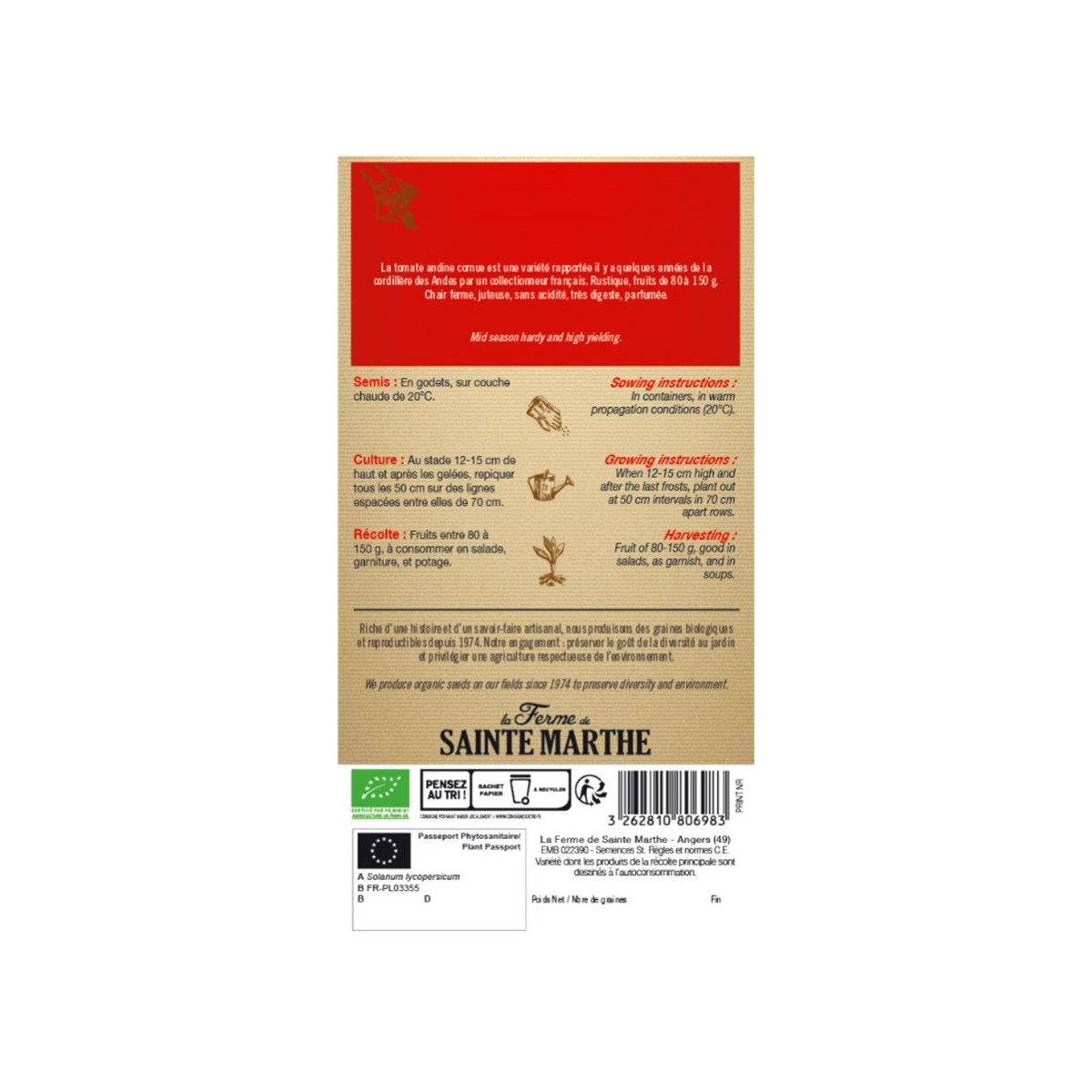 TOMATE Andine cornue AB - Semences reproductibles bio produites par la Ferme de Sainte Marthe