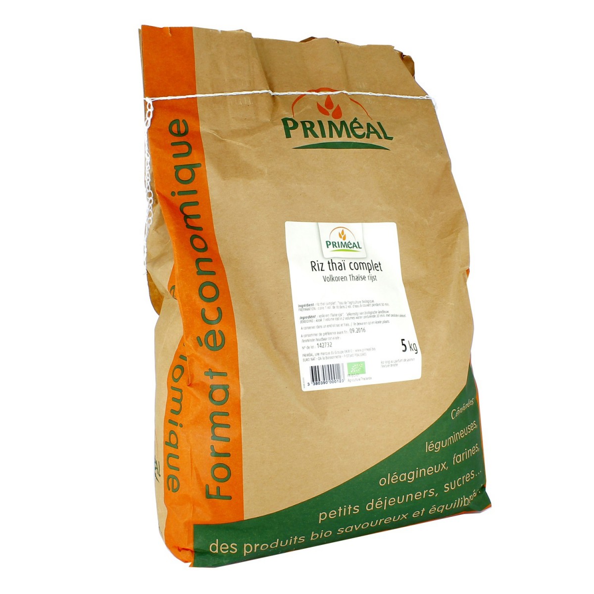 Riz thaï brun complet bio de la marque Priméal Ce riz se distingue par son grain long et son parfum de jasmin. Cuisson : 30 min Origine : Thaïlande Poids net : 5 kg
