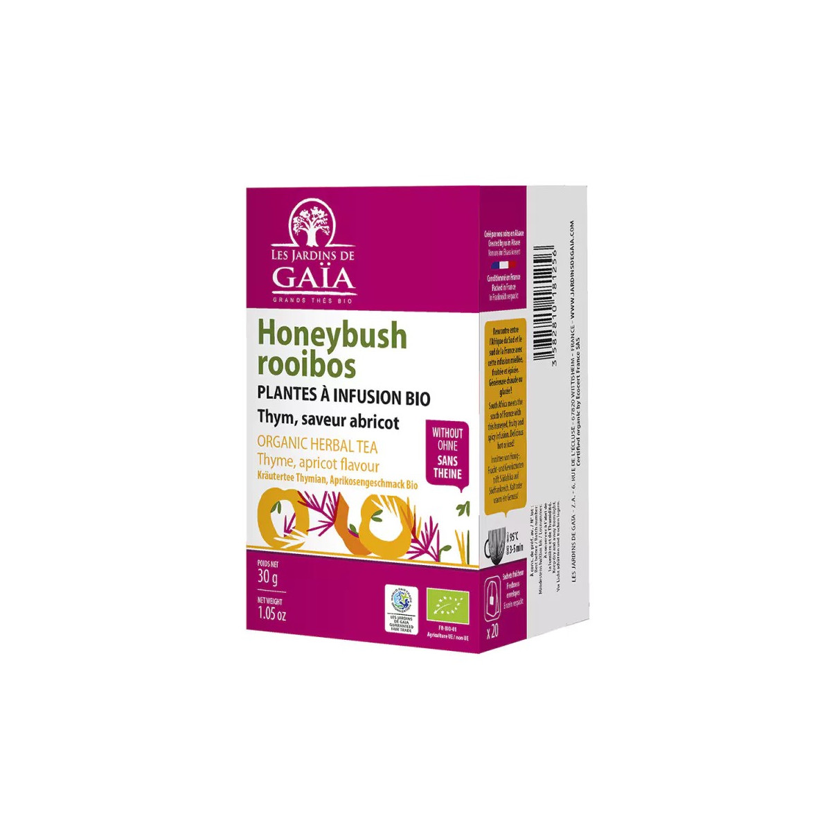 Rooibos* 49%, Honeybush* 38%, Thym* 8%, Arôme naturel 5% (abricot*)