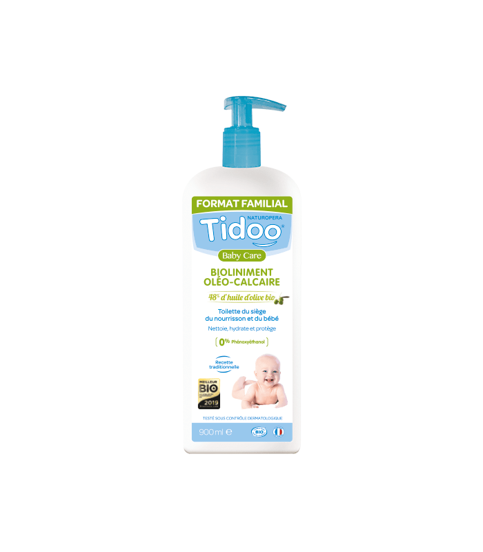 Emulsion onctueuse composée de 48% d’huile d’olive et d’une solution de calcium, le Bioliniment oléo-calcaire de Tidoo nettoie en douceur et protège l’épiderme des fesses de bébé.