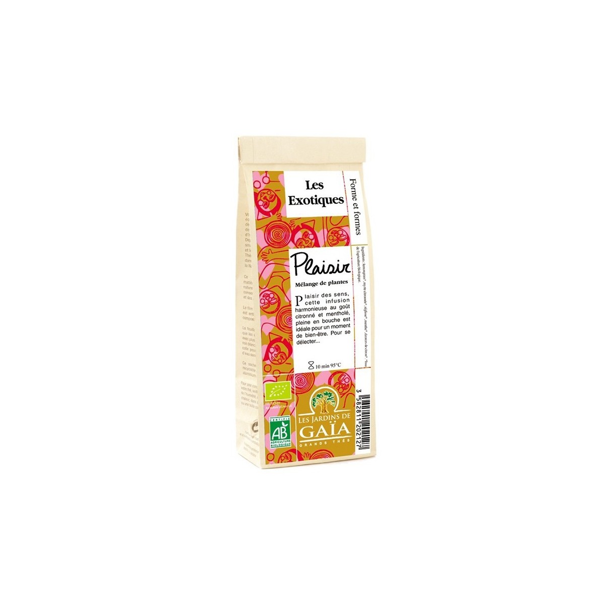 Tisane ""Plaisir"" de la marque JARDINS DE GAÏA. Composition originale qui vient comme un vent citronné rafraîchir les journées estivales. Son infusion, au goût frais et légèrement mentholée, ronde en bouche, extrêmement désaltérante et sans théine, surprendra petits et grands dans sa version classique ou glacée... Ce sachet dans sa totalité est recyclable à 100%, il ne contient ni aluminium ni plastique. Poids net : 50 g