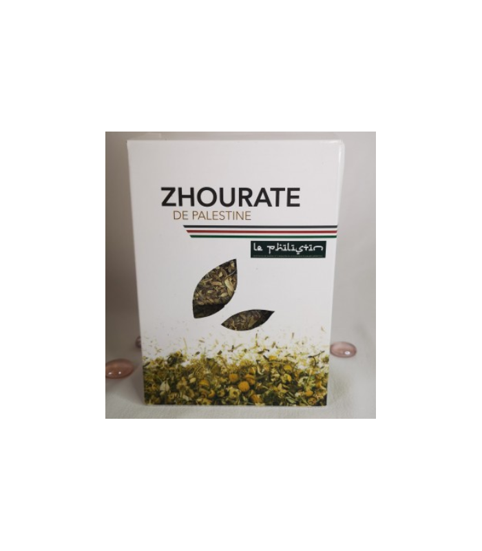 La Zhourate de Palestine est un mélange de plantes naturelles : camomille, rose, fleur de carcadet, fenouil, anis, thym, clou de girofle et romarin. Une boisson relaxante et savoureuse consommée par tous les palestiniens depuis des générations pour entretenir leur capital santé. L'infusion est dotée de multiples vertus : stimulation de la circulation sanguine, élimination des toxines, drainage, amélioration de la digestion pour un bon équilibre intérieur.