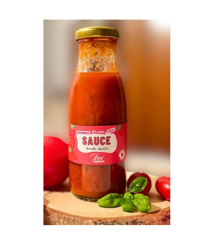 Tomates 82,31%, oignons, concentré de tomates, huile d’olive, sucre blonde de canne, romarin, thym, piment d’espelette AOP, sel, basilic.
